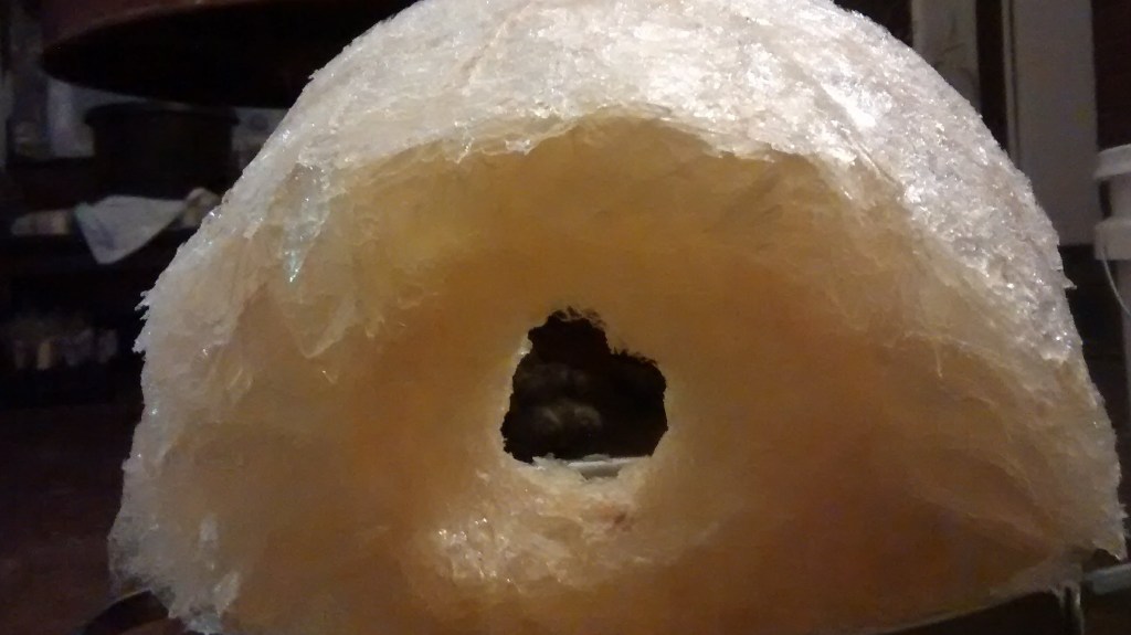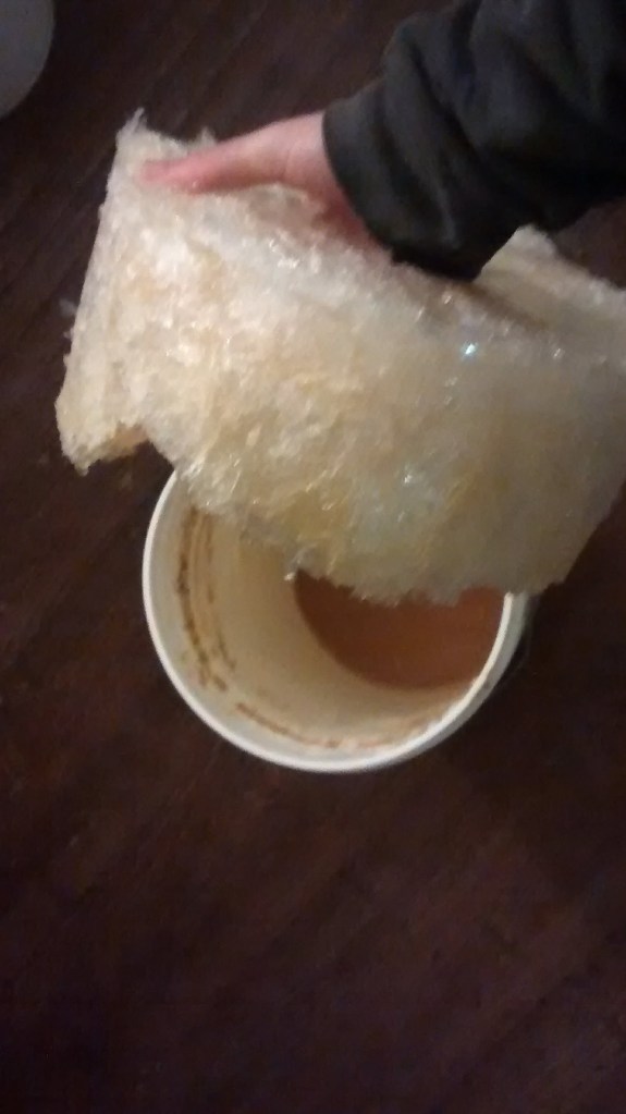 The first few removals had huge ice chunks. I removed them by punching a hole (as pictured) to assist with lifting out. The ice size decreased each time until I really wasn’t getting anymore and considered the process done, or as good as it’ll get in this weather. In total we had a ten day run of temperatures that never climbed above 10 degrees during the day but were well under 0 at night. My cider initially was in the 5% abv range and after the freeze distillation had a distinct “wine” heat to it. While we are uncertain of how much, it did in fact raise in alcohol.