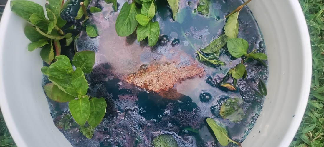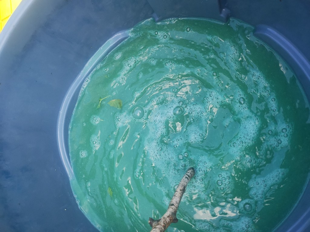 Let it ferment for 3-4 days or until the pigment is noticeably spent from the leaves. You should be able to notice the water having a greenish-blue hue. Discard the plant materials into the compost. Fermenting too long can decrease the amount of pigment.