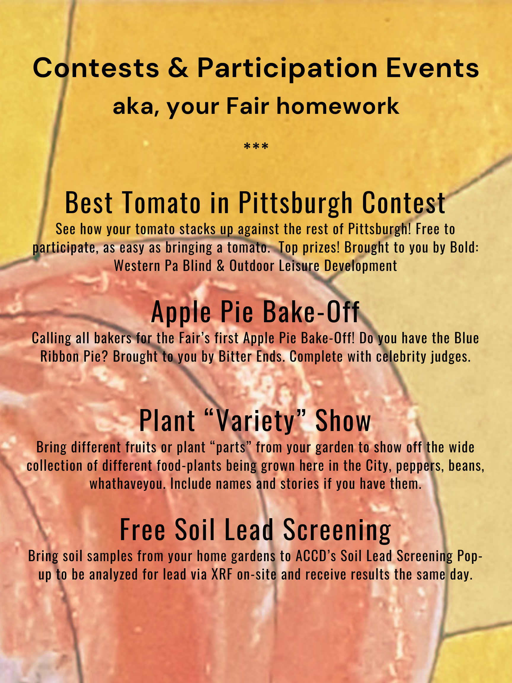 Best Tomato in Pittsburgh Contest: See how your tomato stacks up against the rest of Pittsburgh! Open to any tomato grown within the City Limits. Free to participate. Find more information here. Prizes include: a gift card for Fedco Seeds: for top 3! And a snazzy trophy. Brought to you by BOLD: Western Pa Blind Outdoor Leisure and Development.