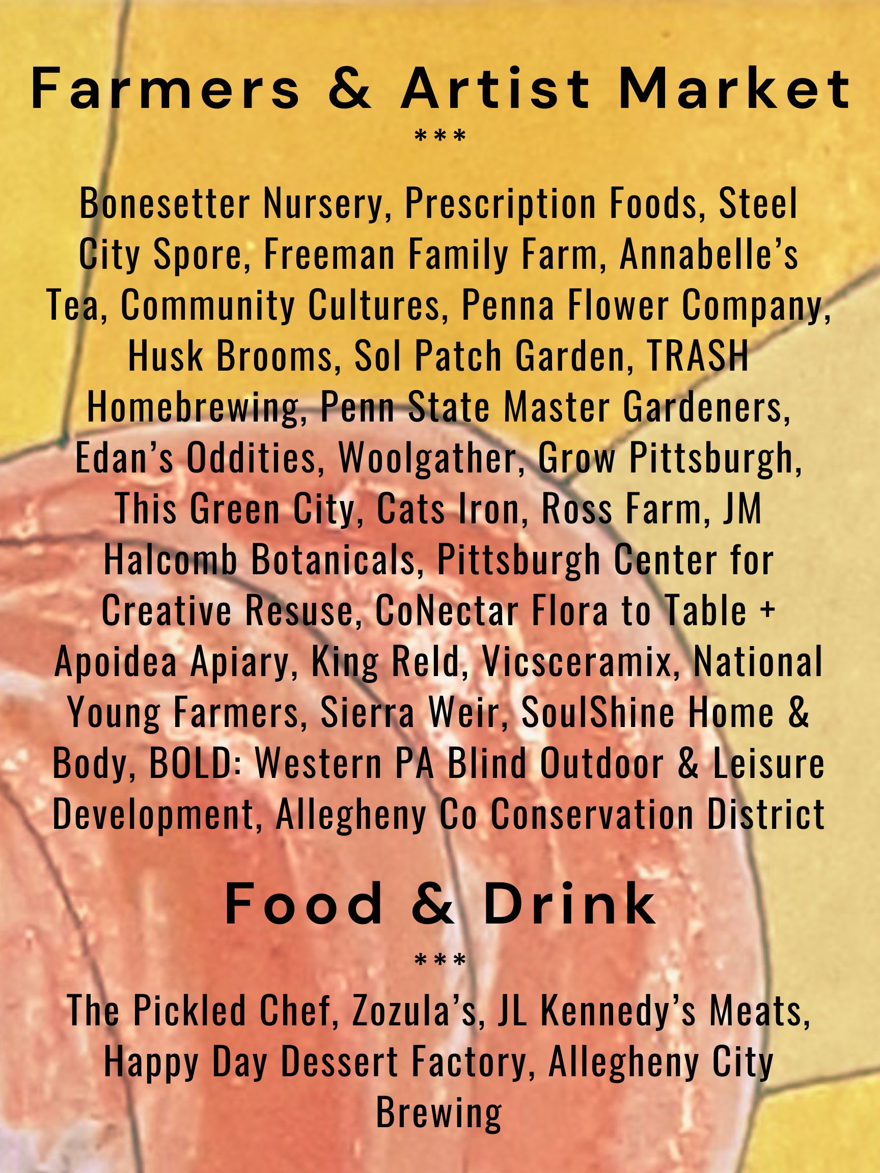 Local Food & Drink: Enjoy locally delicious food from The Pickled Chef, JL Kennedy Meats & Bethany Zozula. Finish it off with homemade ice cream from Northside favorite Happy Day Dessert Factory & beer from Allegheny City Brewing.