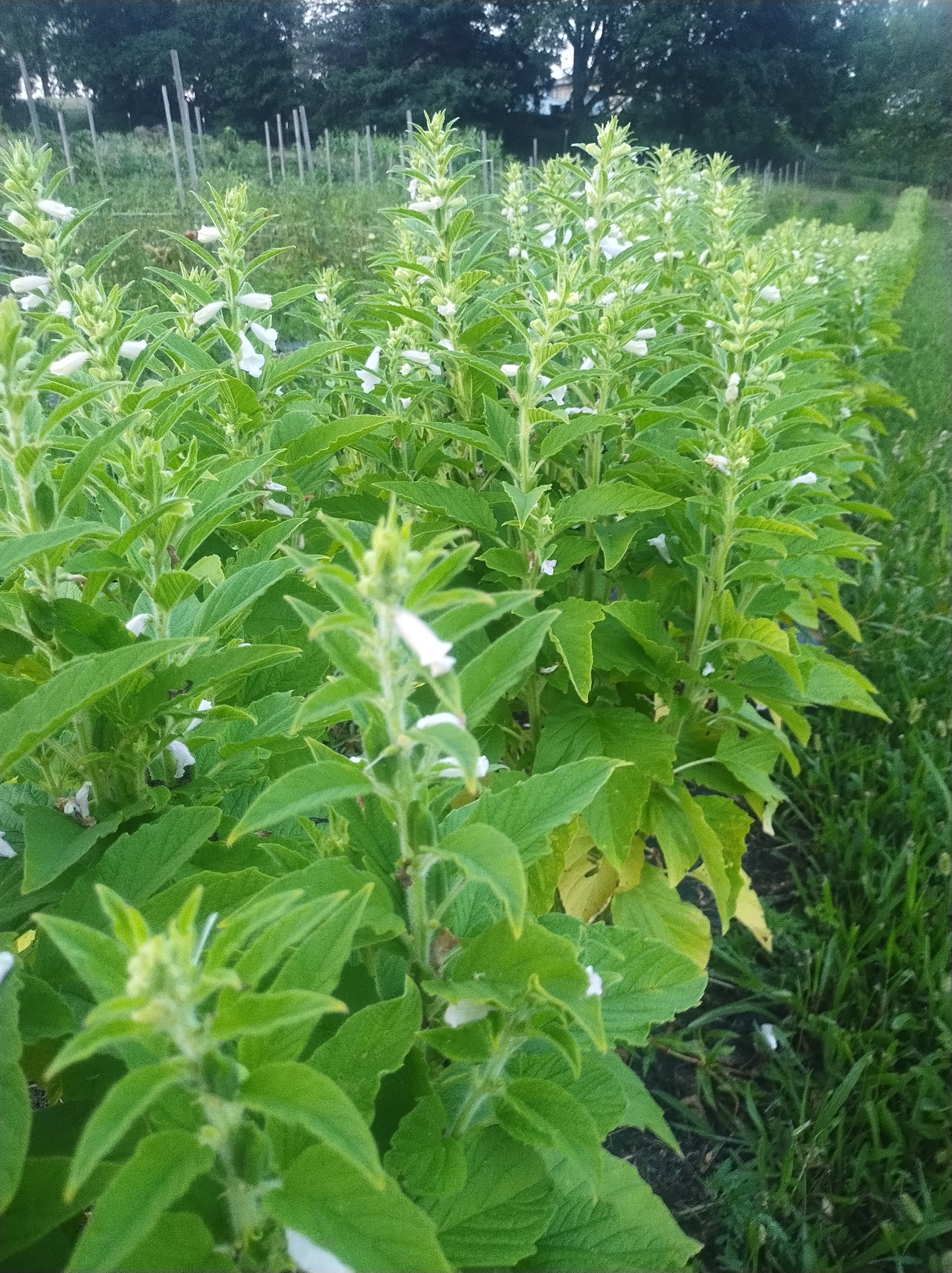 We have been growing benne sesame since the beginning of our farm and love doing it. We start the sesame indoors with tomatoes and typically transplant after all the other May transplanting work is done. The sesame has been a passive crop for us, asking for no special care or maintenance. The plants tend to shut down flowering as the day light fades in the fall and usually begin drying out before a frost arrives. We cut the whole plants and bring them in to finish drying, after which, an easy shake onto a tarp makes collecting the seeds easy. We press the sesame for a very special oil and use it for baking and other recipes.