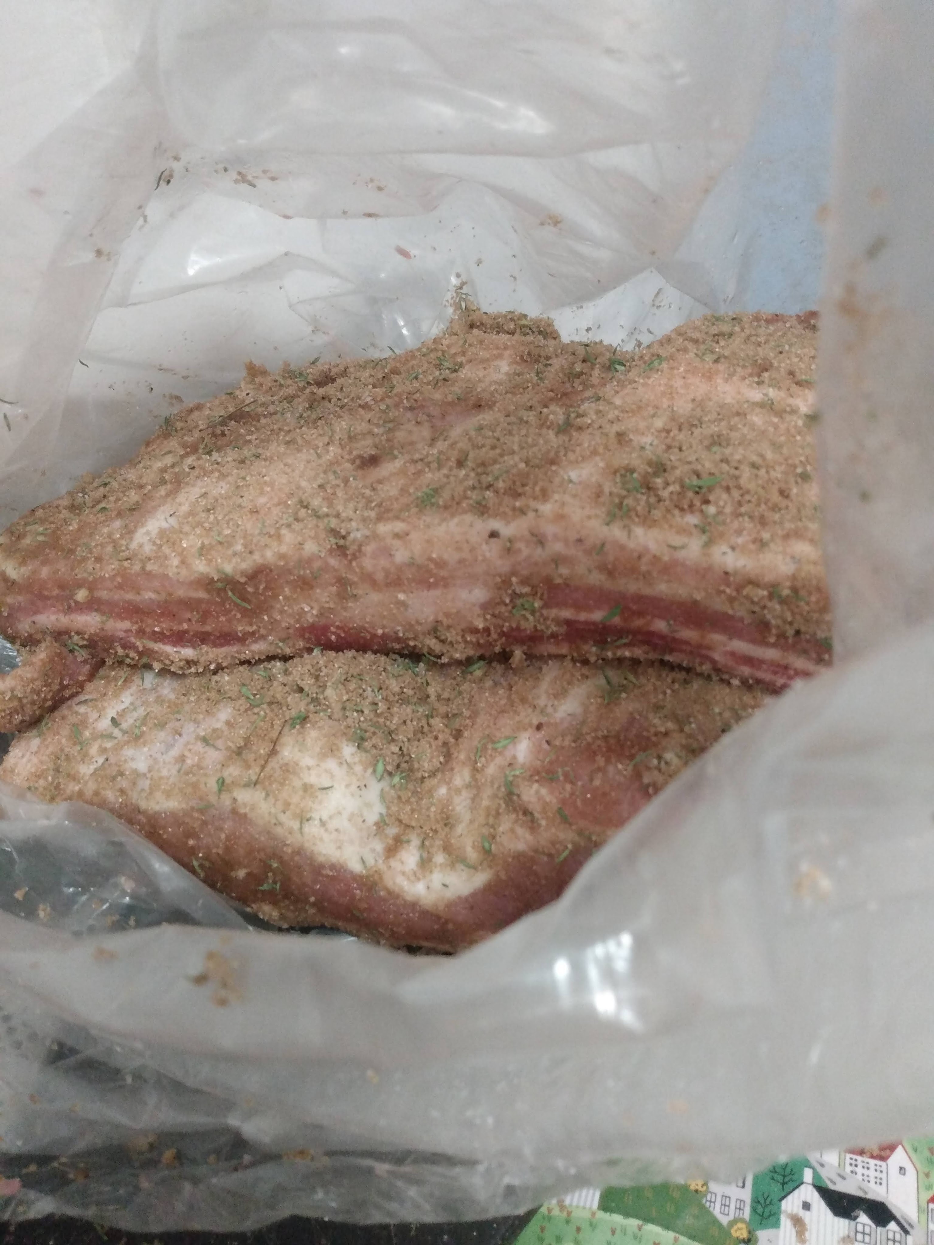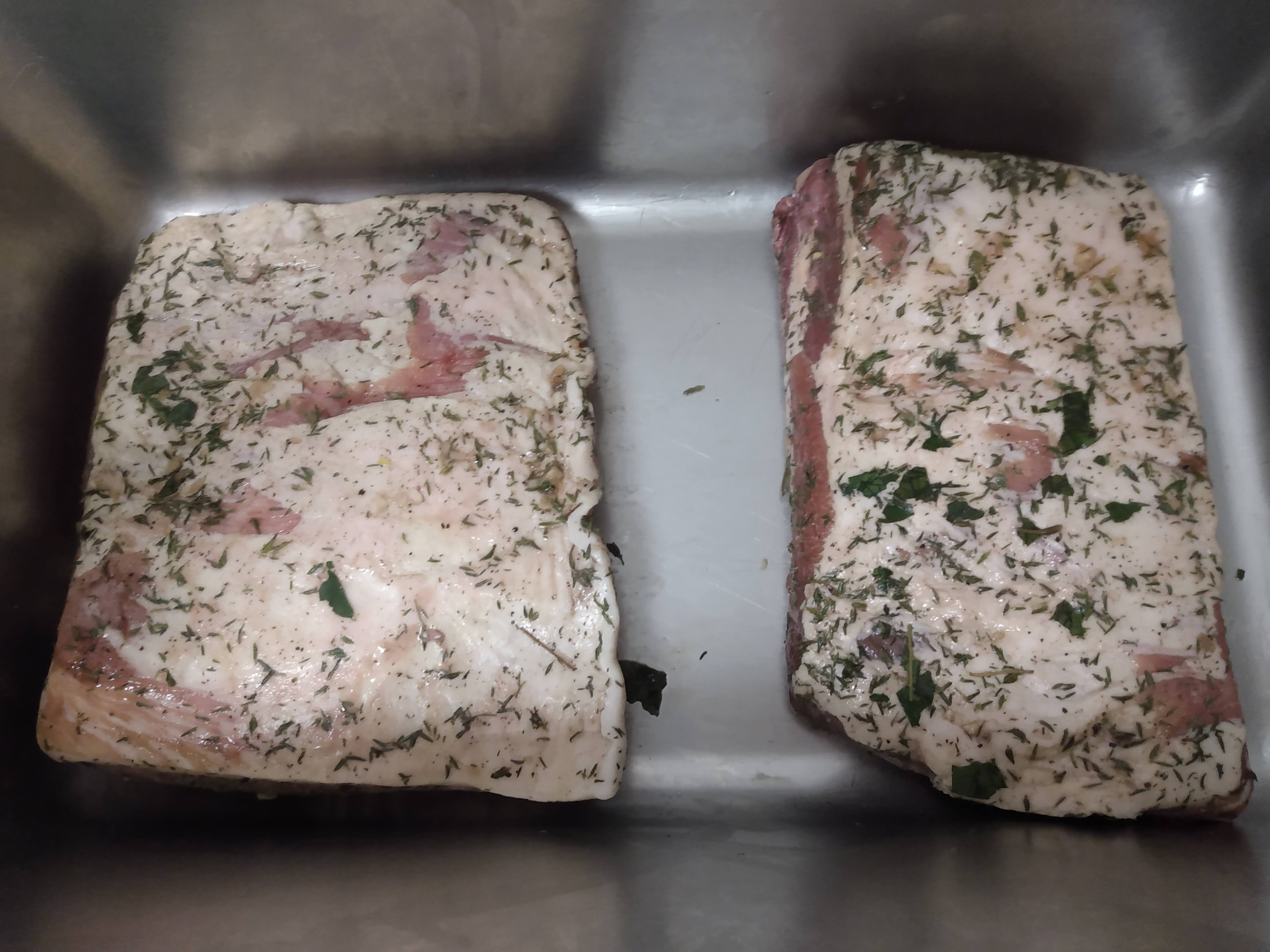Mix everything together- both salts, sweet stuff, and seasonings, and rub it all over the pork belly to coat it. Put the belly and any seasoning that fell off in a bag, stacking them if you have multiple slabs, and place it in the fridge for 6 days. Flip and turn every day or so to keep the marinade even.