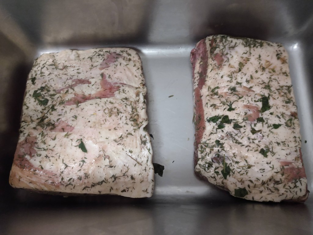 I usually aim for a 1 week process so on the 6th day take the belly out of the bag and place it on a rack with a tray beneath it to catch any falling juices and put it back into the fridge. A cookie sheet with a plate underneath works well. We are trying to dry off the belly. I do this primarily because I smoke my belly and smoke doesn’t stick to wet things well, but it also has a great effect on the roasting color by doing this step. Air drying meat before roasting is a great idea, like chickens for roasting. *Some recipes recommend rinsing the belly prior to drying, I presume to remove any excess marinate so maybe the herbs and sugars won’t burn during cooking. I used to do this but don’t anymore. I don’t have any problems and I like the way it looks more. Go with your heart.