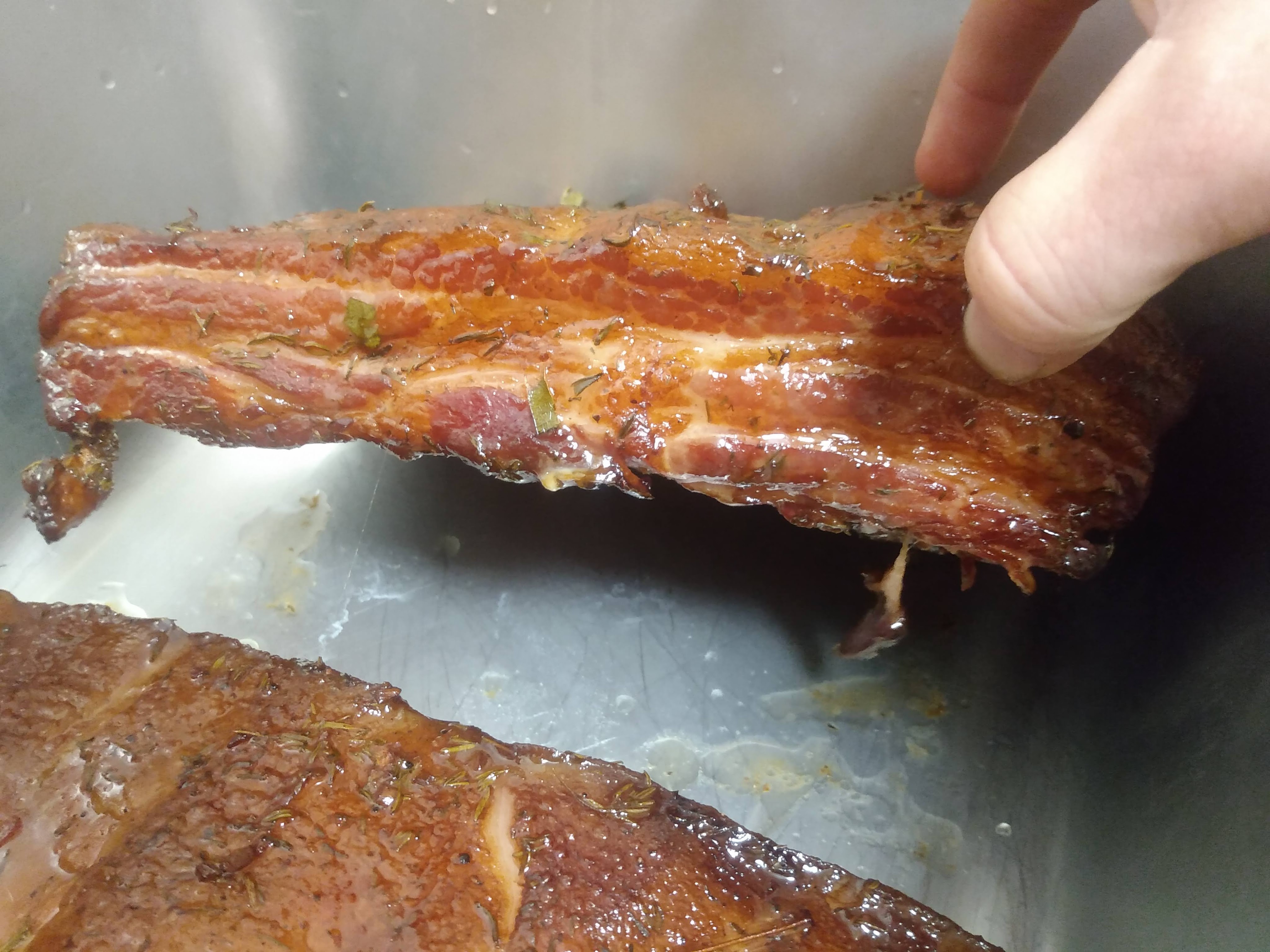 First thing after it’s done, eat a fresh hot bacon snack by working the odd nubs that hang around the edges. This is one of the highest moments of human experience, relish in it. Then let the belly cool and then refrigerate it. If you’d like to slice your bacon, whether by hand or if you’ve got your hands on a commercial meat slicer it’s best to toss the belly in the freezer until it’s about 1/3 frozen. This will give you a slab that is firm enough to make uniform cuts more easily.