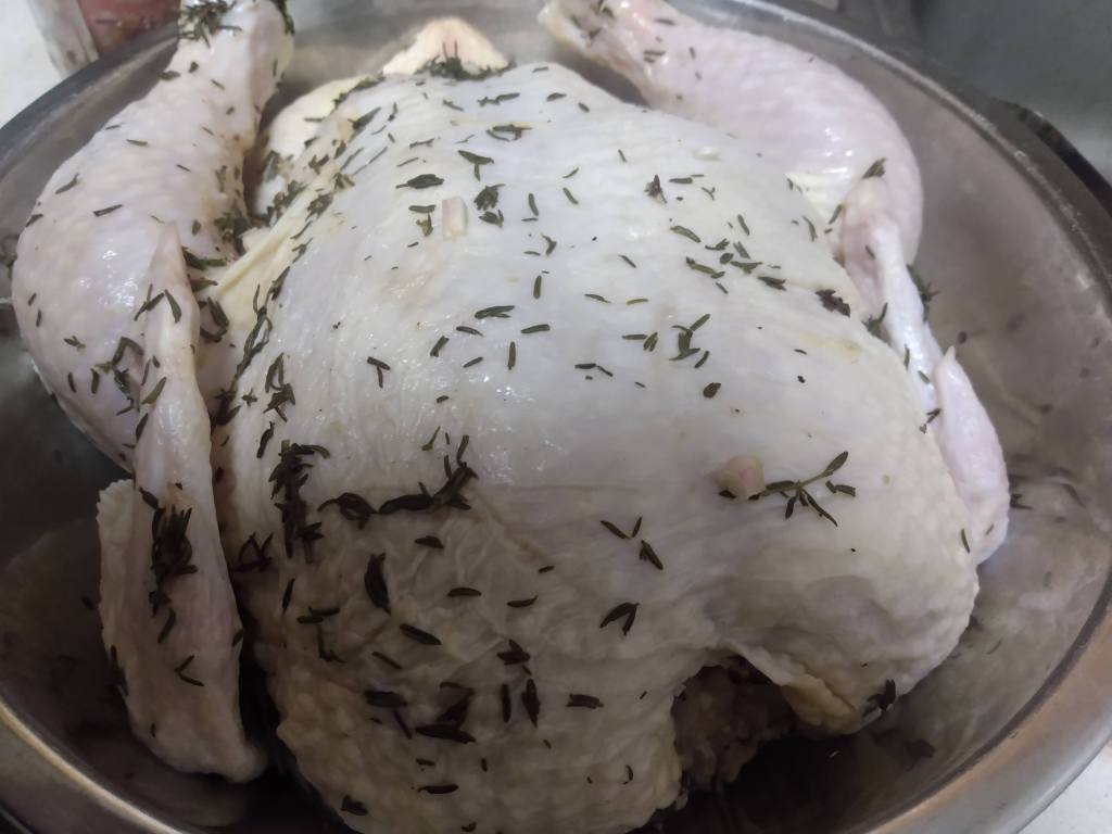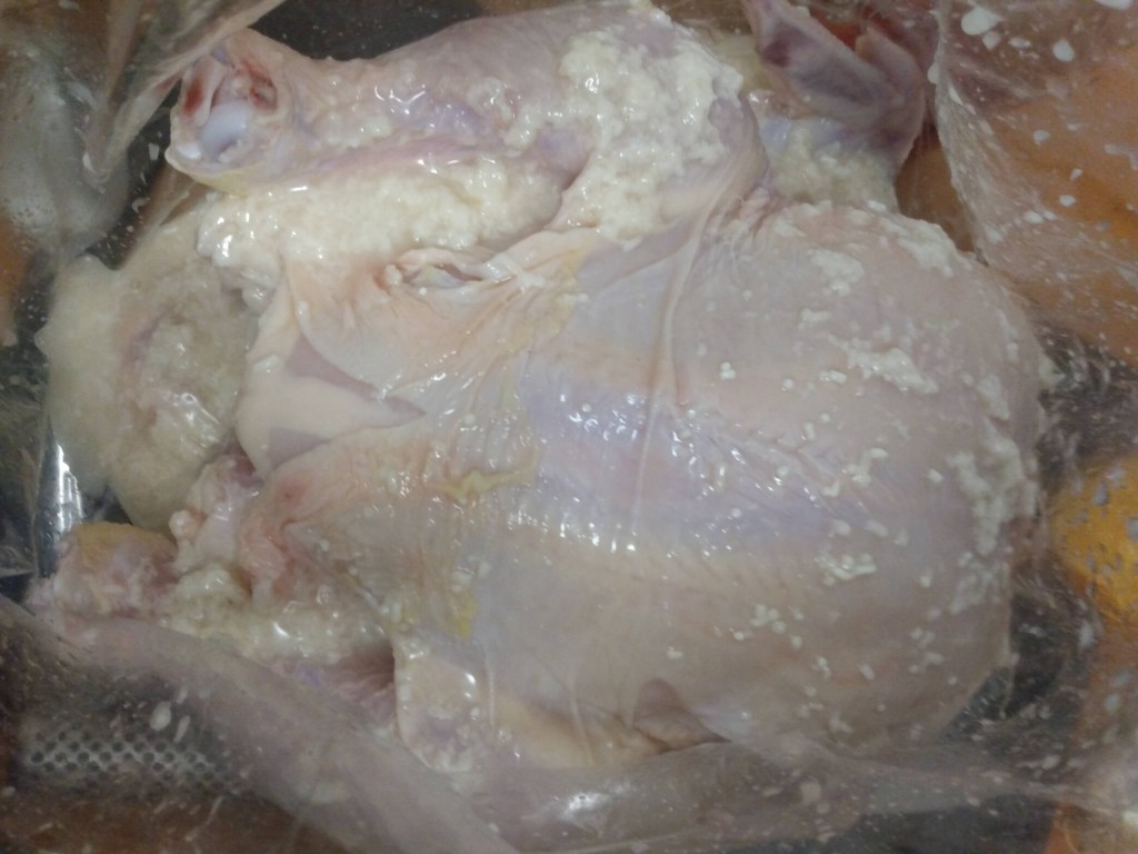 After at least a week, but more better to be three, take a leak-proof bag and empty the shio into it. Then add a couple cloves of minced garlic, a handful of thyme, some cracked pepper or pepper flakes, a couple slices of lemon, then plop in your whole chicken and tie the bag shut. Through the outside of the bag mix and massage the marinade into the chicken coating the whole thing and put it in the fridge.