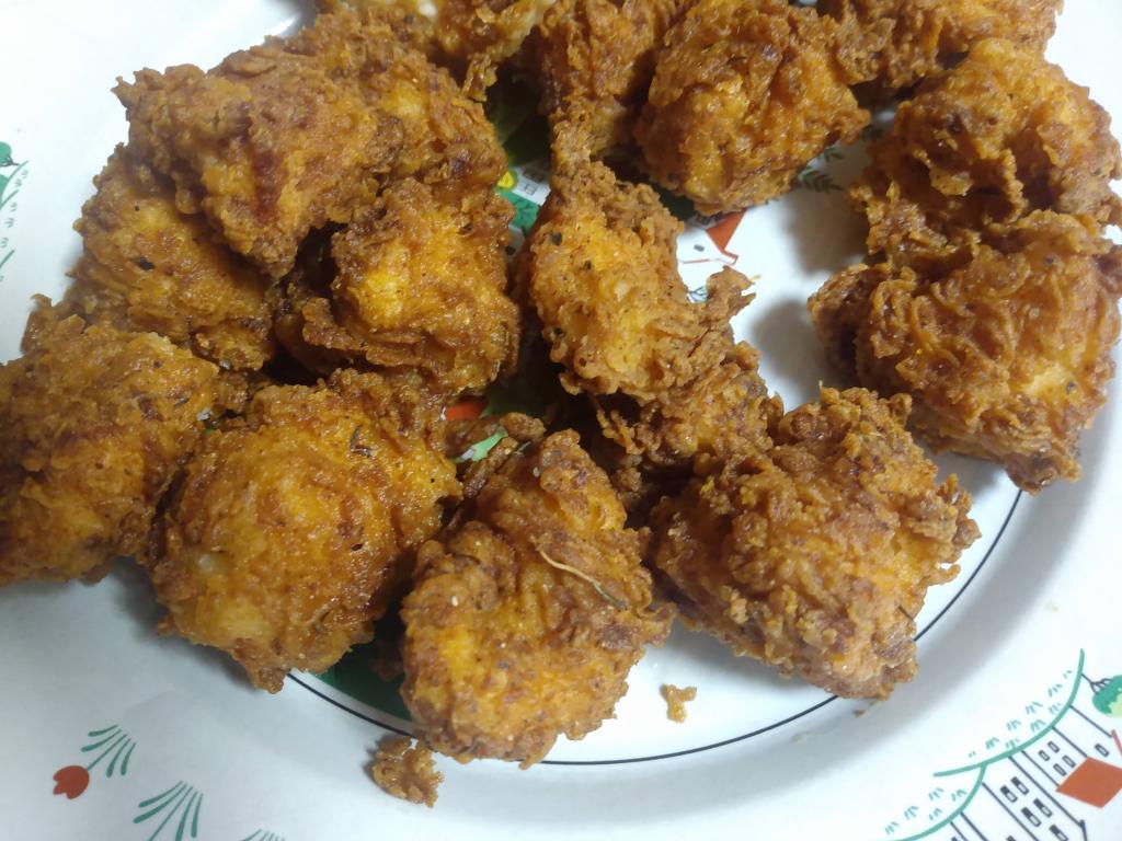 For the fried breading use flour as a base and season to heck out of it with your favorite seasonings or mix. Things like paprika, mustard, black pepper, thyme, onion powder, garlic powder, etc, etc. Or go whatever route excites you- 5 spice powder? We’ll add a handful of cornmeal too for texture. Don’t forget to add salt as well. Often we’ll mix everything together and cook a little test peice to check the salt level because there are a lot of variables at play here, like how long and strong your marinade was.