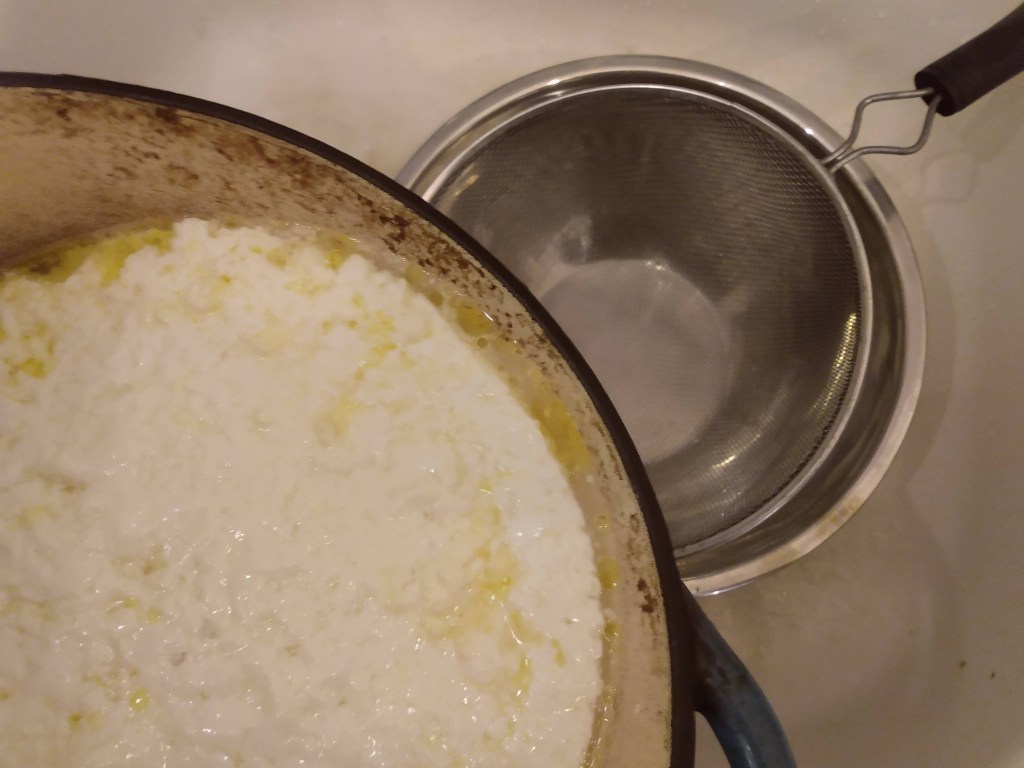 Strain the curds out in either a cheese cloth, a fine strainer, or t-shirt even- though not necessarily letting it strain entirely. There is potential to decide the moisture content of the finished ricotta, which feels like the artful side of making this cheese. It’s better to strain less than more, and thoughtfully continue straining until it reaches an elegant and appropriate consistency for what you will be using it for.