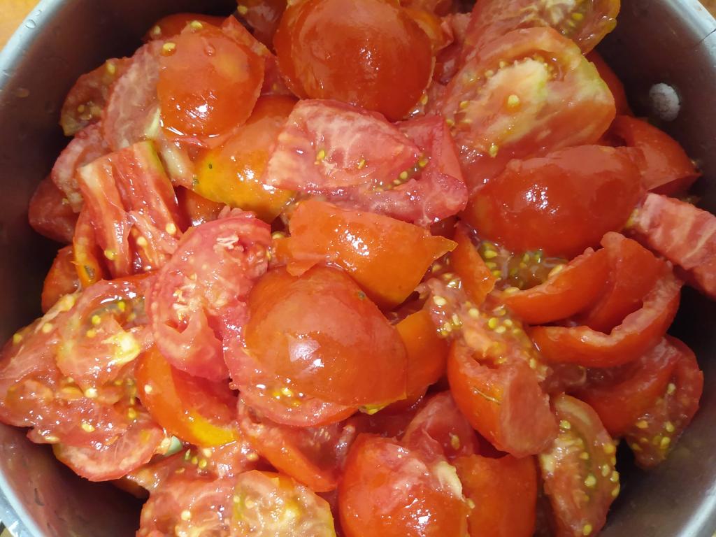 Start by cutting up the tomatoes and placing them into a container to ferment in. Nothing else needs added, just leave at room temperature with a secure covering- cloth or otherwise, for 3-7 days.