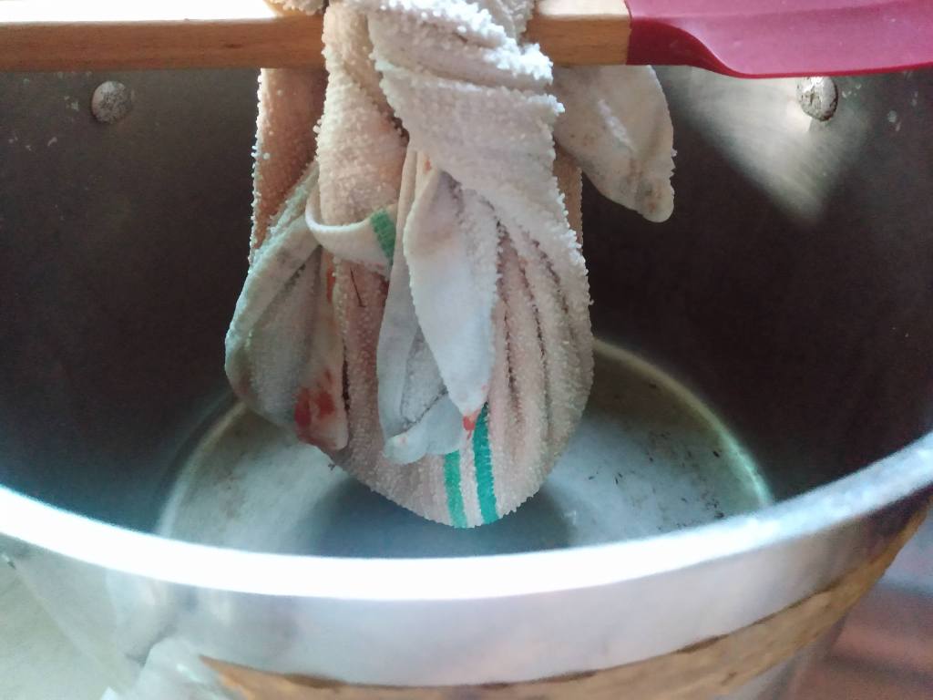 Get a friend and start cranking. Do a handful of stalks at a time according to how much your machine and cranker can handle. Usually we’ll have one person feed the stalks and the other turn the crank as the juice flows out to a pot below.
