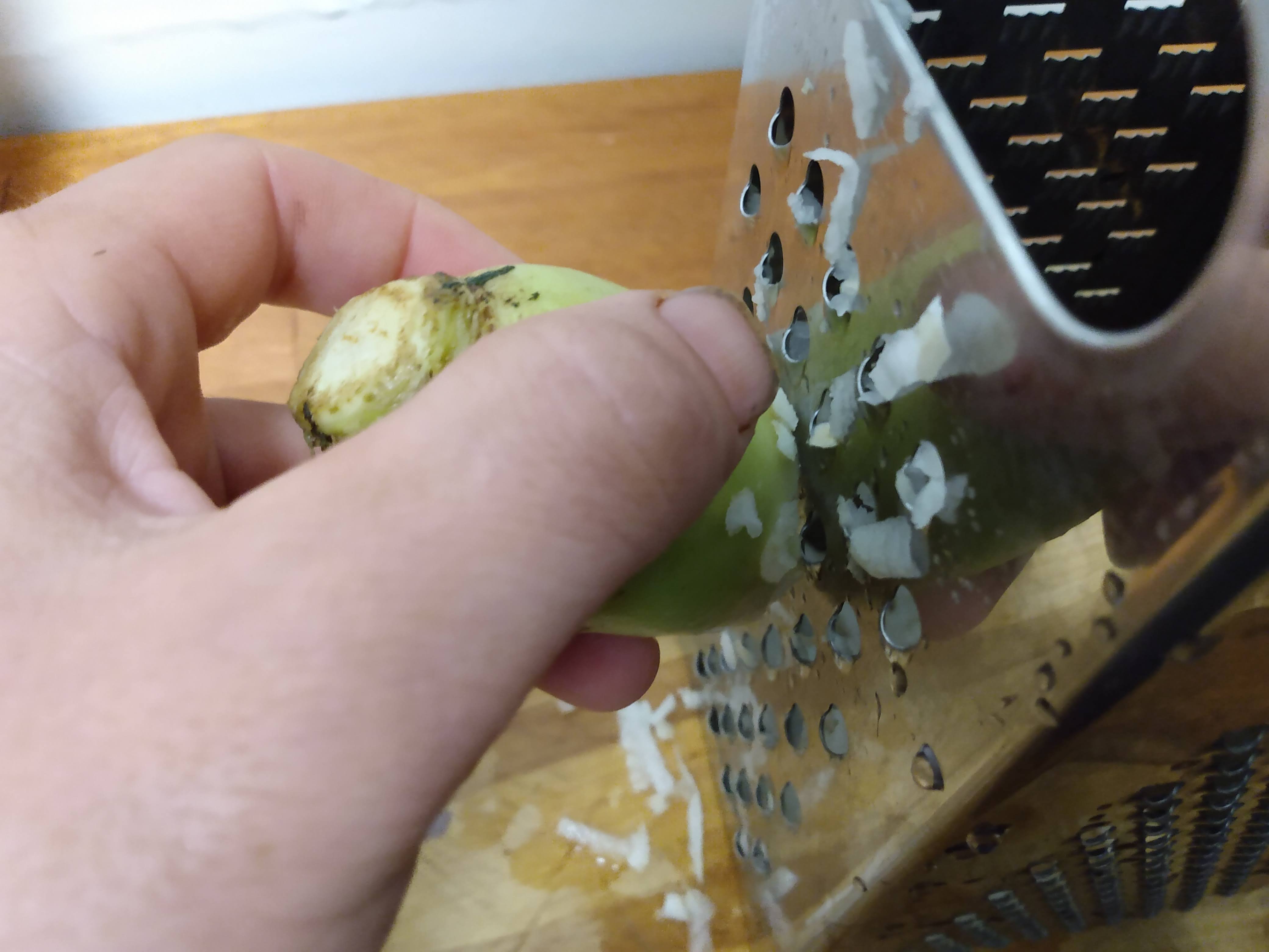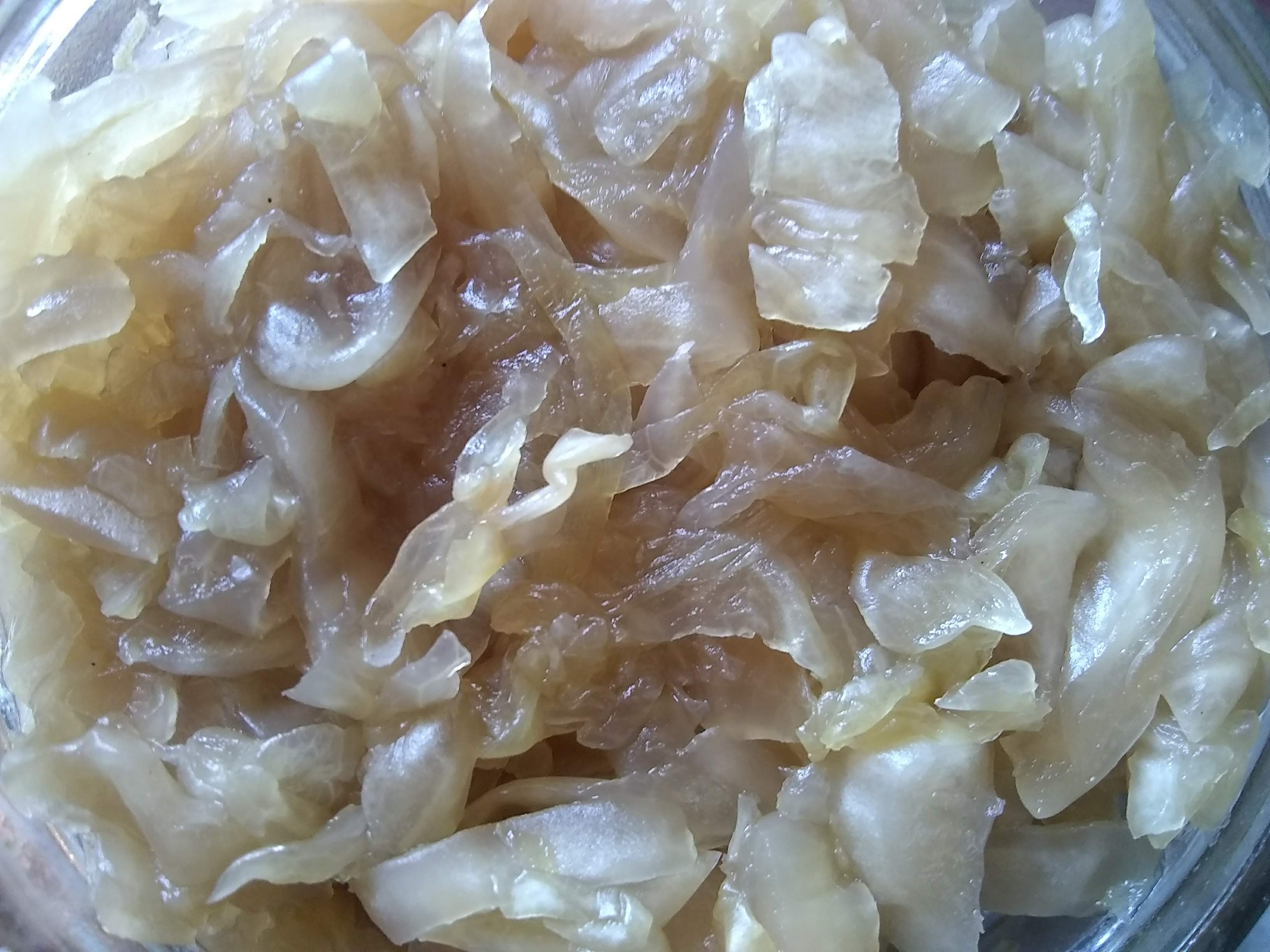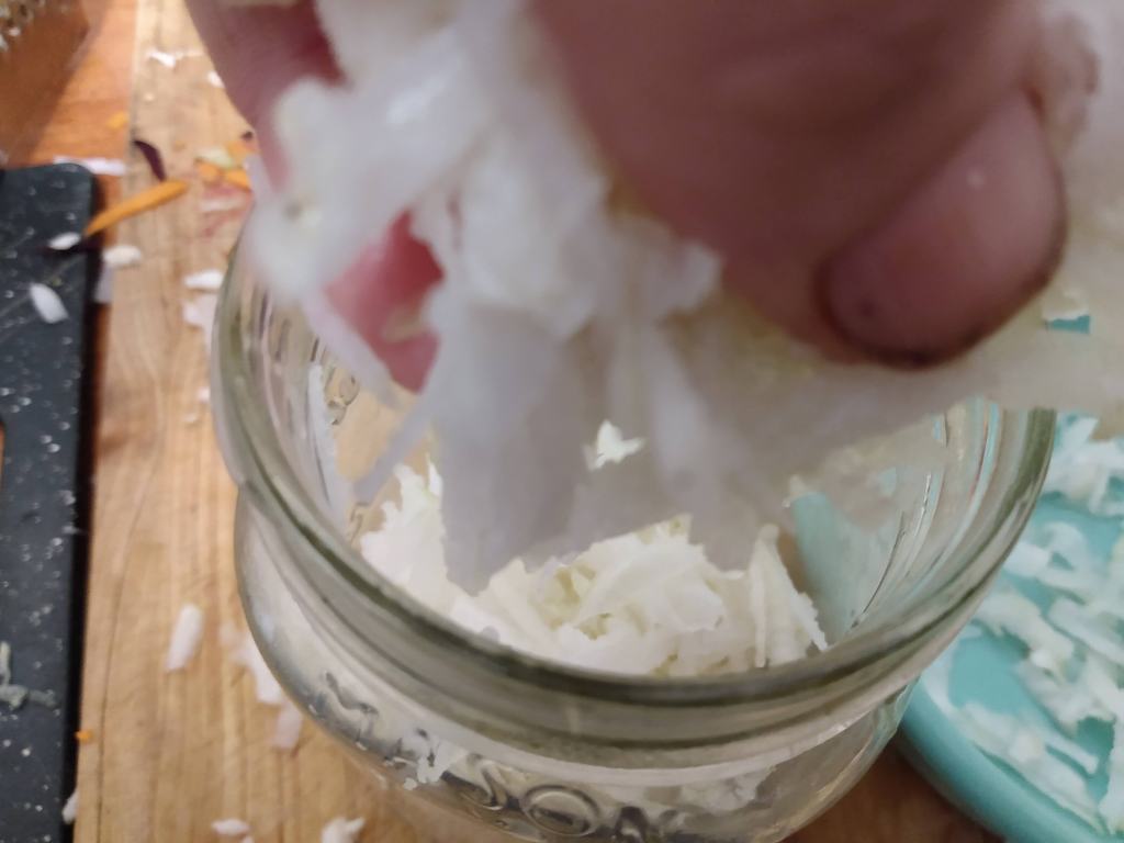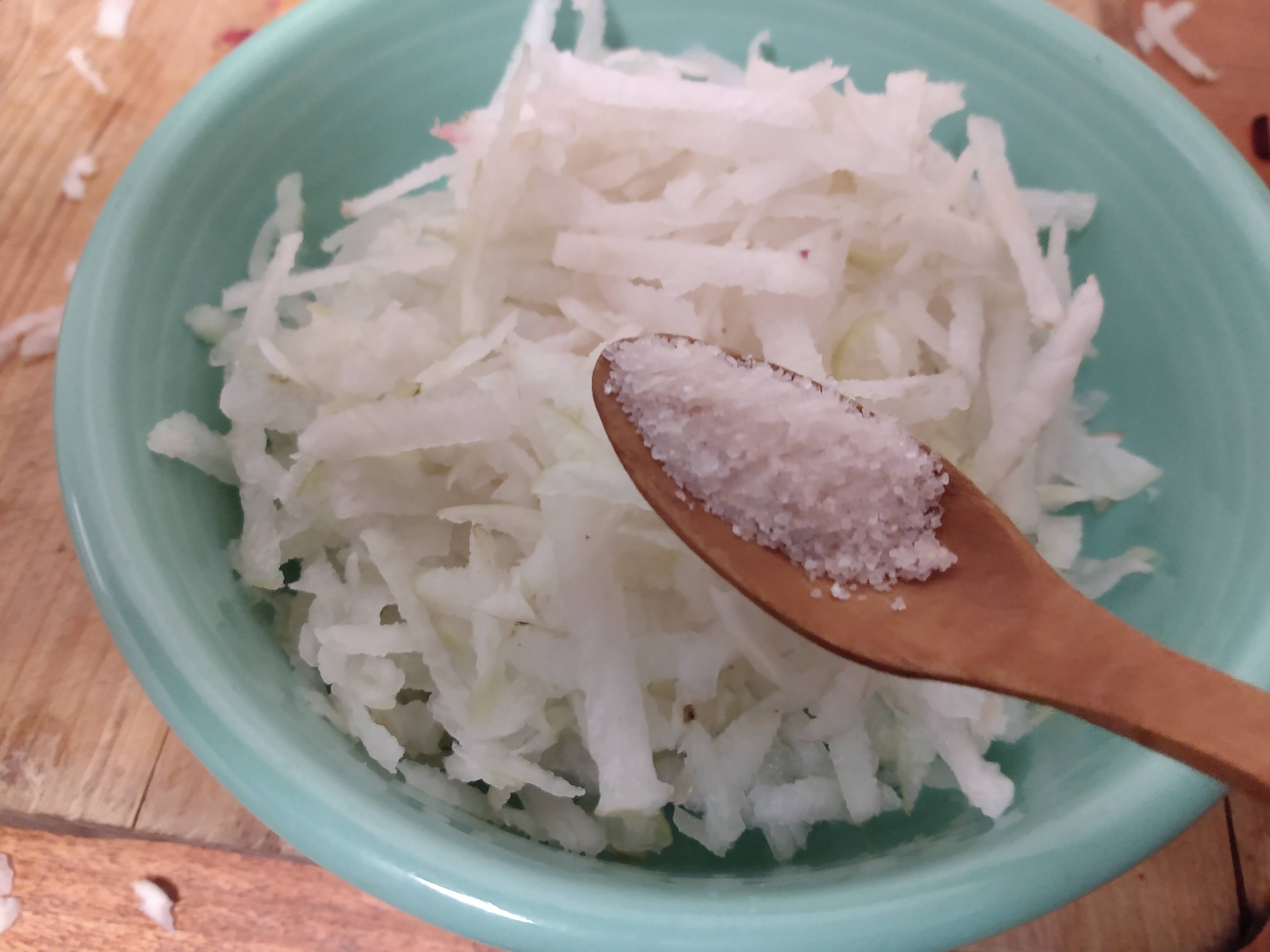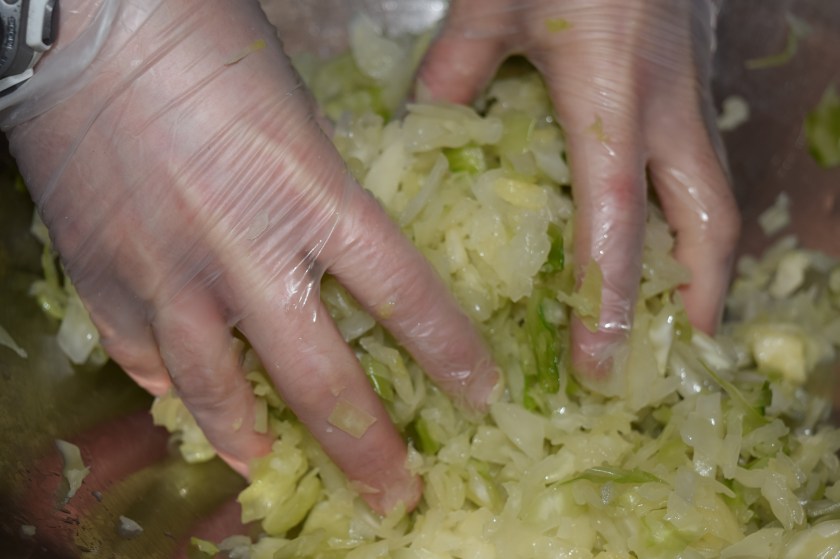 Mix with salt, let’s say 1 & 1/2- 2tsp per a pound of cabbage, but salt to whatever is your taste preference, there’s no wrong answer. Then massage, pound, stomp, or club your cabbage until its giving up its water.