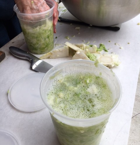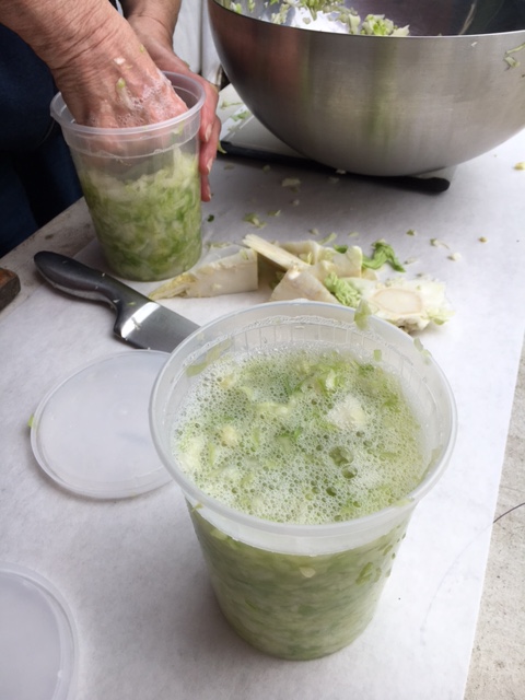 Now pack the cabbage and its brine into your fermenting vessel of choice, pushing it down so that all the cabbage is in brine. Be careful not to overfill as it will rise and possibly spill over, so give a couple inches of headspace.