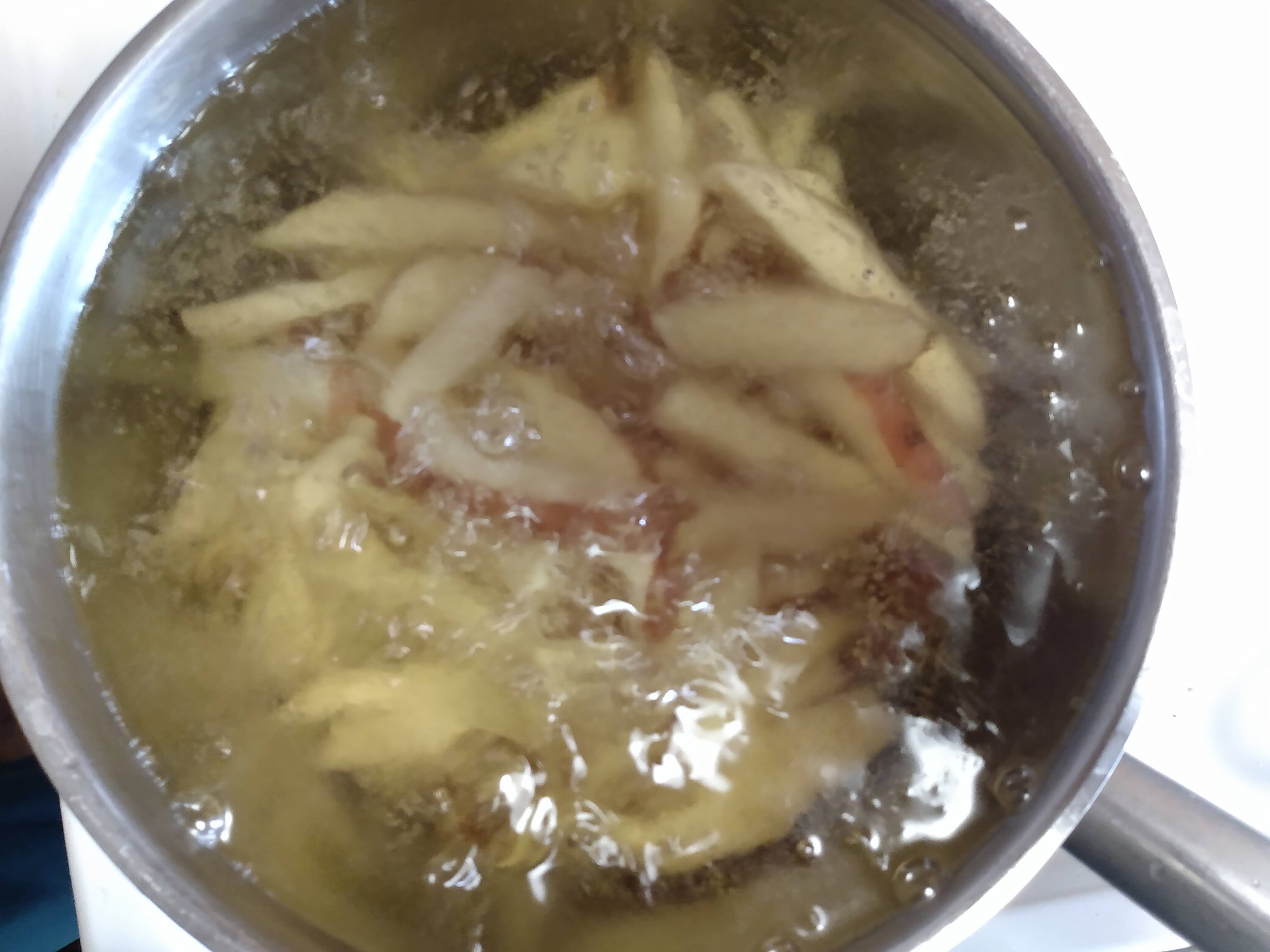 Peel off any weird outer leaves from your green cabbage. Cut the cabbage in half to remove the core, then proceed to slice the cabbage into ribbons or whatever shape you’d like.