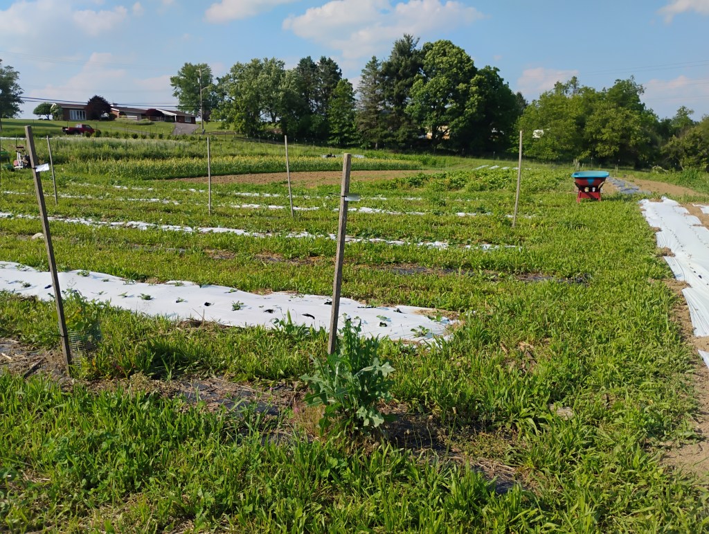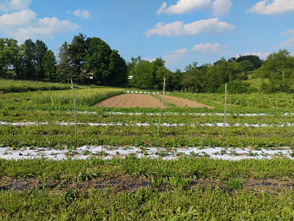 For the mixed goal of growing for food preservation and to sell to the public to support the project typically center around classic summer crops like tomatoes, peppers, eggplants, potatoes, onions, squash, garlic, greens, herbs, and soforth. Sweet corn took hold in the line up later on after seeing the impact it made on bringing more people to the weekly Farm Stand, and remains has been the only hybrid grown on the farm, which after some iffy trials with OP corn, we’re transitioning to Lofthouse corn. It is common practice to prioritize more space to these crops for larger plantings in order to not feel required to make heavy production demands while still getting enough. A part of the growing philosophy is to leave a percentage of the crop unharvested to assist in countering the loss in nutrients from what gets pulled out of the field. We attempt to approach the fields with a thoughtful and gentle mindset so the health of the area is always considered in relationship rather than by solely human will. We initially did light schedules of organic permitted pest products but have wained that back to very little spraying, if at all. Insect exclusion fabric coverings have taken the place most spraying, and if any crop is getting hit too hard we’ll make adjustments like when the crop gets grow, or if it’s grown at all. For example, we grow brassicas in the spring until the harleqiun bugs move in towards August, and then those crops are done. Though we’ve been able to get away with late summer plantings of cabbage on opposite ends of the field.