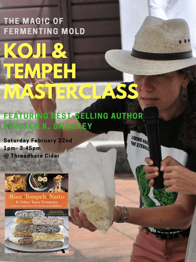 Learn what all the cool kidz are talking about—fermenting with mold. Koji (Aspergillus Oryzae) and tempeh (Rhizapus Oligasporis) are molds with superpowers: They amplify flavor and help grains and legumes become healthier by making them easier to digest and adding nutrition. Koji is the secret sauce to many traditional ferments from sake to miso but there is so much more—it can tenderize meat, make vegetables into “charcuterie”, ferment foods, and produce pickles. Tempeh is moving beyond a soybean cake and has the power to make hearty delicious foods from grains and beans. Come meet koji and tempeh with bestselling author Kirsten K. Shockey as she takes you through an info-packed presentation on cultivating koji and tempeh. Use both of these for countless applications. The class includes a hands-on portion where you make your own homemade miso to take home and ferment. She will also answer any of your fermented grains or beans questions.