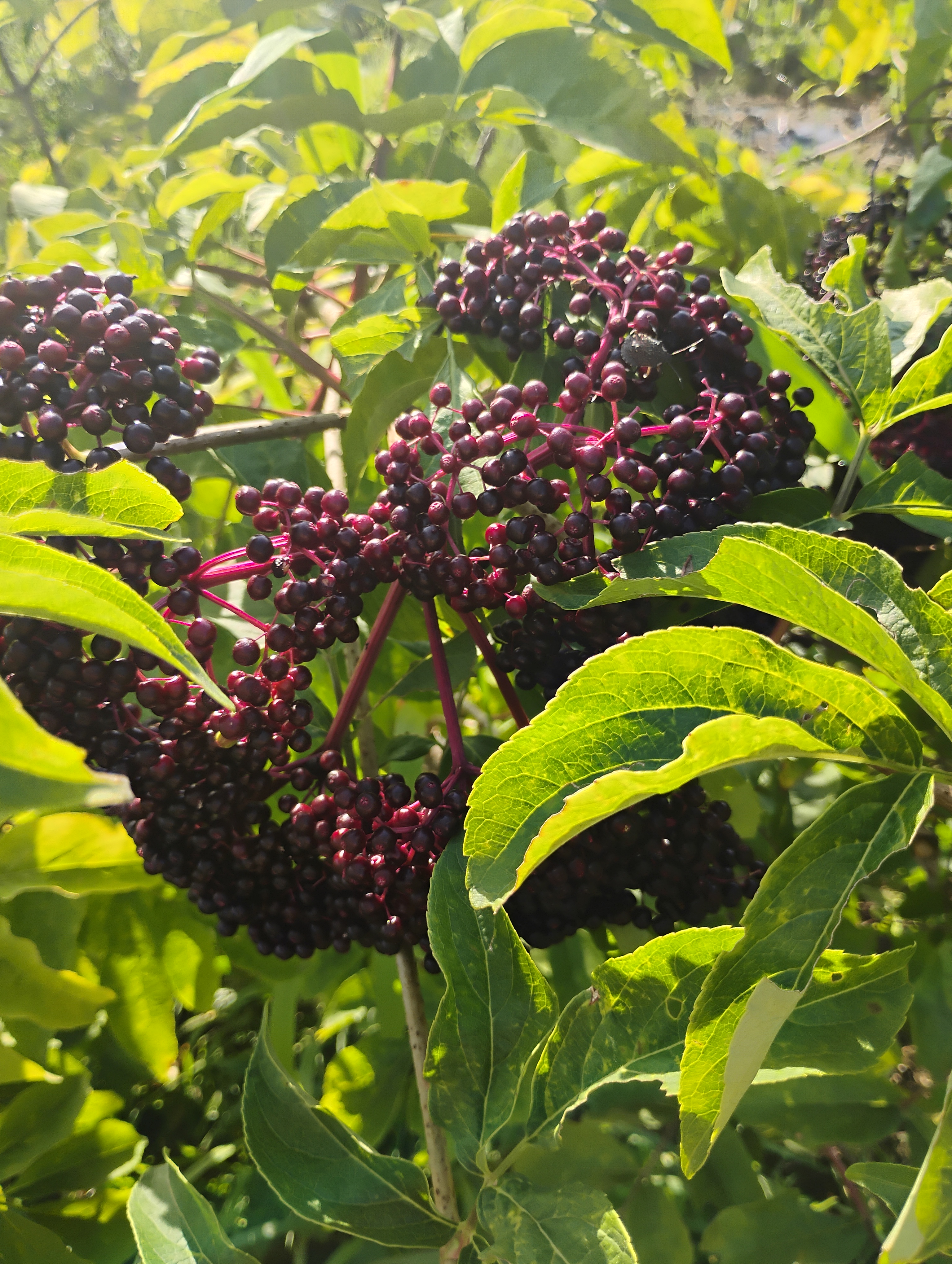 We have 220 feet of elderberries specifically for fruit for wine and jelly. We harvest our flowers from elders out in the “wild” because we can have more say over protecting the berries from birds in our field. The fields were started from stakes directly put into rows. Each year the elders are fully coppiced to a stump a few inches high. This helps us control the space the elders take up and multiplies the branches of new growth. It does make it so our elders come into season a tad behind, say, the untouched one down the street. The pruned off wood gets either propogated or in some cases saved for flutes or whistles.