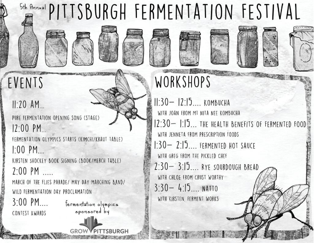 Fermented Food Contest/ Culture Swap: Do you have the best kimchi is Pittsburgh? Or is sourdough bread your butter? Bring enough to sample and share by Noon on Sunday. Have extra cultures? Bring some to share! Contest voting and sampling all day with awards at 3:30pm. More information.